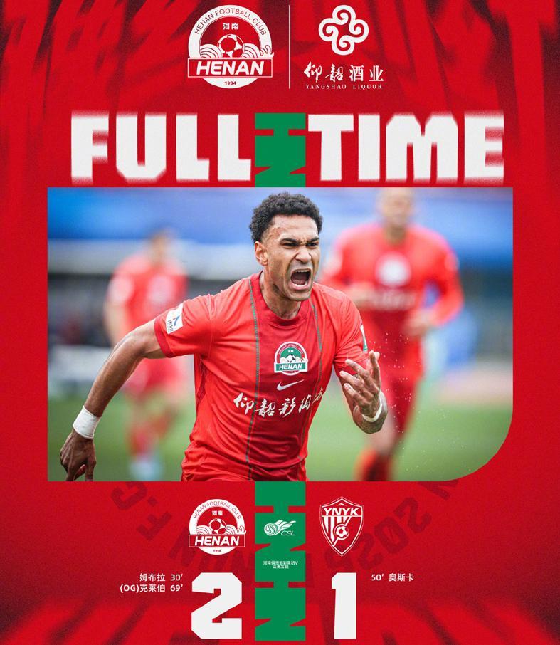随后,古斯塔沃打进了一个越位球。第62分钟,河南队打反击,姆布拉门前抢点头球又没顶进,浪费了多次机会了。第68分钟,钟义浩右路突破,被布尔克拉倒在地,创造了一个前场定位球,纳萨里奥主罚,克莱伯头球解围,皮球划出了一道诡异的弧线,直接钻进自家大门。乌龙球!河南队2-1再度领先!